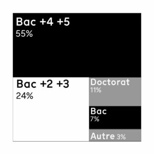 Enfin, pour terminer ce début de portrait, nous constatons que l’échantillon est très diplômé avec 55% à un niveau Bac +4 ou +5 (Maitrise, Master,…), 24% en Bac +2 ou +3 (DUT, BTS, Licence…) et 11% de Doctorant·es. Cette répartition nous conforte dans nos missions de médiations numériques qui permettent à des publics moins diplômés de construire une culture documentaire avec des partenaires comme la Fédération des Centres Sociaux ou Solid’action.