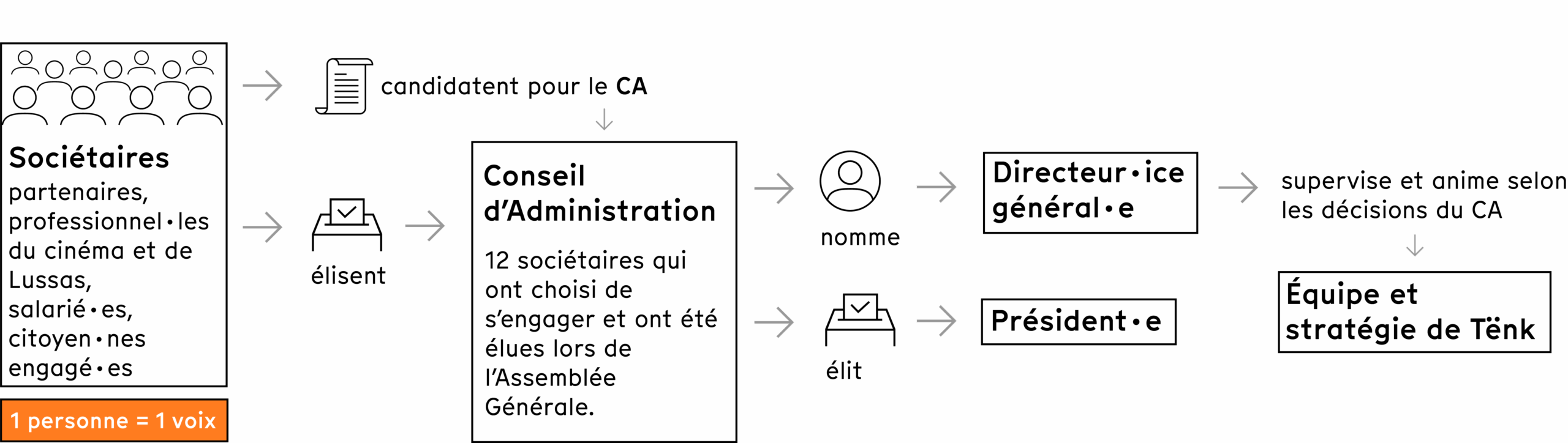 Tënk appartient à 350 sociétaires, des professionnel·les du cinéma, des abonné·es, des salarié·es, des partenaires… Tous les ans, les sociétaires et tous les autres acteurs de Tënk (programmateur·rices, salarié·es, conseil d’administration) se réunissent pour un moment très spécial : l’Assemblée Générale. C’est lors de cet événement que les sociétaires peuvent candidater et élire les administrateur·ices, 12 personnes qui guideront la société dans ses choix stratégiques. Rejoindre Tënk, c’est participer à son avenir.