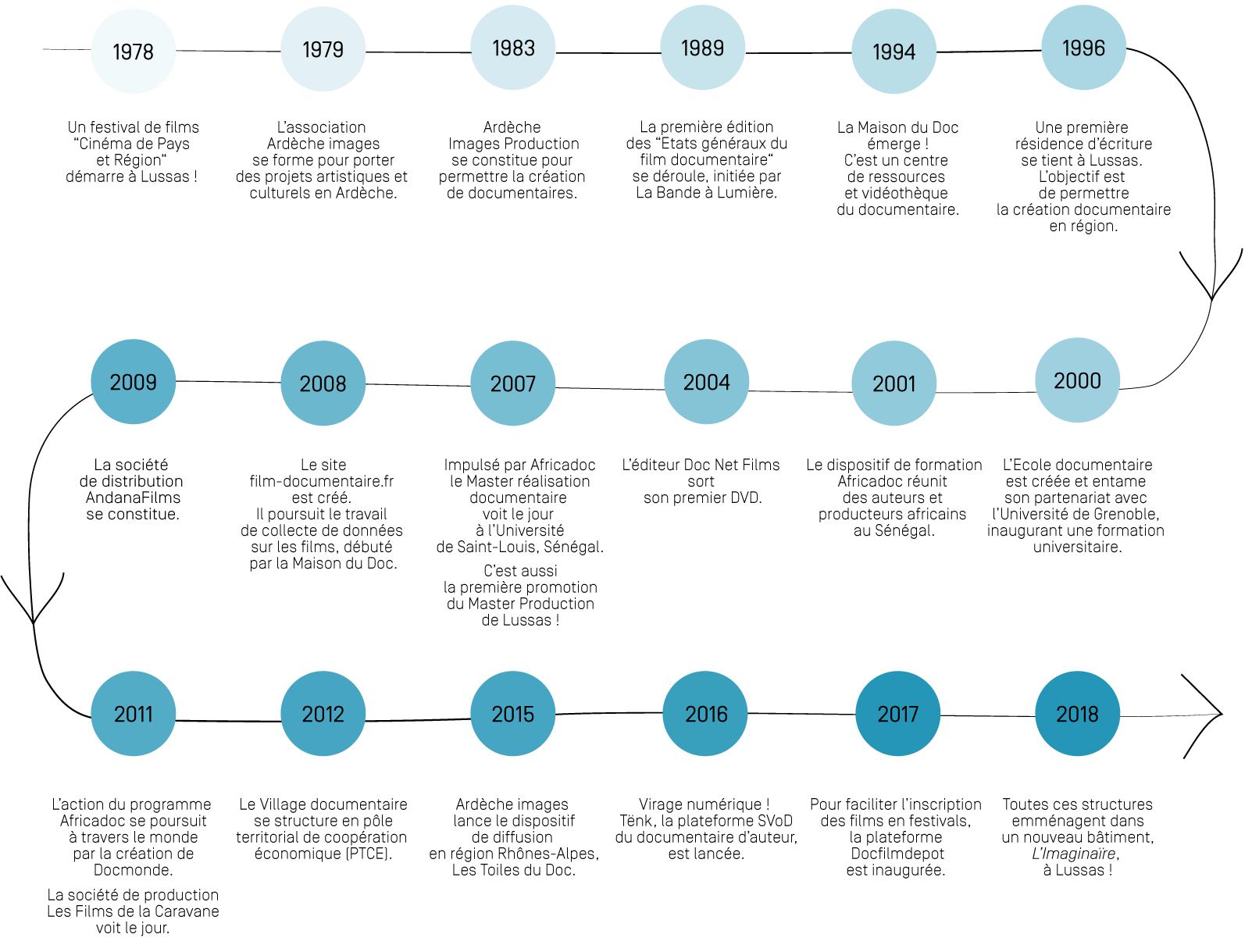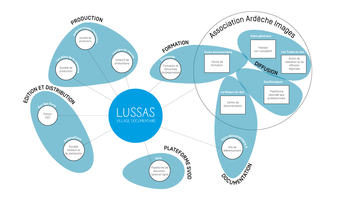 L’activité audiovisuelle y a grandi et s’est diversifiée avec l’aspiration d’être présente à toutes les étapes de fabrication et de diffusion d’un film. Chaque structure vient apporter sa contribution à une logique plus globale, pour composer aujourd’hui un « écosystème » en faveur de la création documentaire, souvent fragilisée par le manque de soutiens financiers. Le Village documentaire de Lussas, ce sont des idées dans tous les sens, qui deviennent petit à petit des structures administratives avec une réalité économique. Mais ce sont surtout des gens. Certain·e·s restent longtemps, certain·e·s quelques semaines seulement. Et c’est bien toutes ces énergies qui, depuis 40 ans, convergent pour faire advenir quelque chose de rare. Ce qui existe aujourd’hui à Lussas, on le doit à la coopération des multiples talents qui sont un jour passés par là.