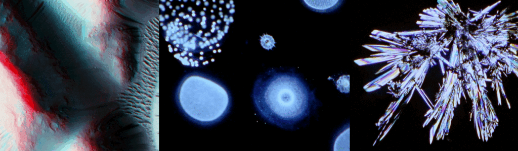 Malheureusement, une partie des prises de vue se sont organisées pendant la pandémie de COVID19. Je ne pouvais donc pas filmer là où c’était prévu. Je souhaitais travailler dans certaines grottes spécifiques avec des scientifiques spécifiques, mais tout n’était pas accessible. Au lieu des prises réelles prévues initialement, le film est plutôt fait de citations et d’images re-filmées. En fait, je trouvais des images scientifiques et je les re-filmais avec ma caméra. En fin de compte, le film s’appuie sur beaucoup de sampling.