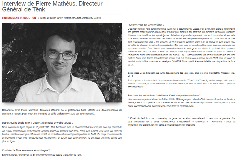 Retrouvez ici l’article rédigé par Emma Mahoudeau Deleva le lundi 23 juillet 2018 pour MediakWest. L’occasion de découvrir l’interview de Pierre Mathéus, directeur général de Tënk !