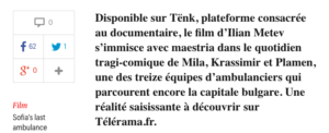 Accueil - Revue de presse - Télérama – « Regardez le documentaire « La dernière ambulance de Sofia »