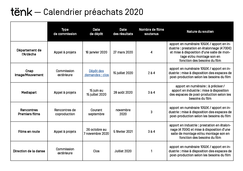 Ainsi depuis 2018, nous avons pu soutenir 38 films, accompagnés par 27 sociétés de production différentes. Les premiers films voient le jour depuis quelques mois, et cela continuera en 2020 ! Vous trouverez ci-bas le calendrier des préachats pour l’année en cours.
